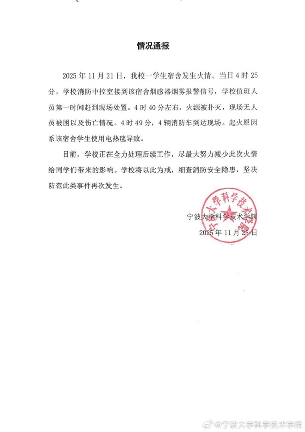 11月25日,@宁波大学科学技术学院发布情况通报: