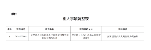 根据《关于进一步规范省科技创新计划项目变更、终止和结题工作程序的通知》(湘科计〔2021〕7号)有关规定,拟同意“无序堆叠目标机器人三维视觉引导智能抓取技术与应用”项目重大事项变更申请,现予以公示。公示期为2025年11月25日至12月1日(公示期为5个工作日)。