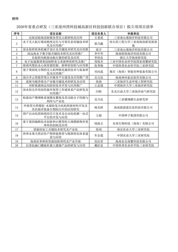 根据《海南省重点研发专项和经费管理暂行办法》(琼科规〔2025〕6号)、《海南省重点研发专项项目定向征集暂行办法》(琼科规〔2022〕5号)等有关规定,经公开申报、形式审查、专家评审、行政决策等程序,确定2026年省重点研发(三亚崖州湾科技城高新区科技创新联合项目)拟立项项目20个。