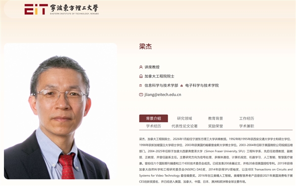 据宁波东方理工大学官网,加拿大工程院院士,人工智能专家、加拿大西蒙弗雷泽大学工程科学系教授梁杰,已全职回国,于2026年1月加盟宁波东方理工大学任信息学部讲席教授。
