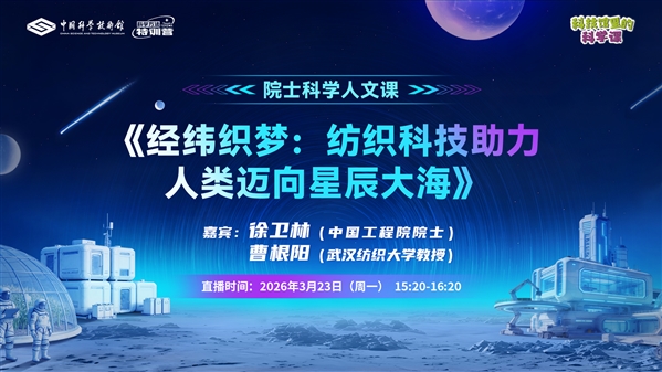 从“天问一号”的耐高温弹性组件,到嫦娥五号、六号在月球上成功展示的“中国红”国旗——这些大国重器背后,隐藏着怎样的纺织科技奥秘?本期直播特别邀请到中国工程院徐卫林院士及团队带来题为《经纬织梦:纺织科技助力人类迈向星辰大海》的院士科学人文课。我们将一起从航空航天中的高性能纤维复合材料的话题出发,探秘纺织技术如何突破极端环境极限,服务国家重大战略需求;并通过回溯纺织技术在文明演进与大国崛起中扮演的关键角色,展望纺织技术在未来生物医药、智能可穿戴等前沿领域中的应用前景。