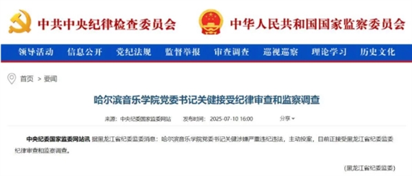 2025年7月10日,黑龙江省纪委监委通报,哈尔滨音乐学院党委书记关健涉嫌严重违纪违法,主动投案,接受纪律审查和监察调查。