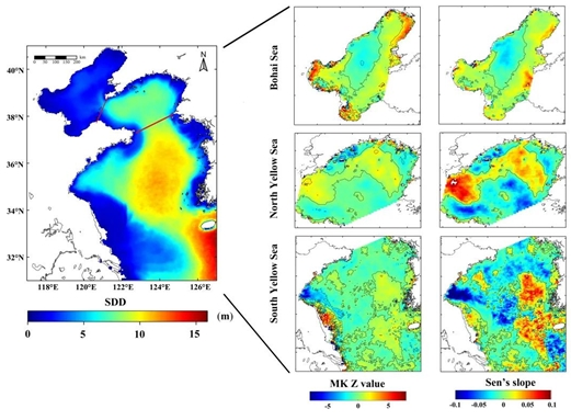 禹定峰说,人类活动影响着黄渤海海水光学组分,成为海水透明度逐渐下降的重要因素。研究水体透明度的时空变化和驱动机制,对水环境变化、水体光学参数、水体富营养化等具有重要的现实意义。