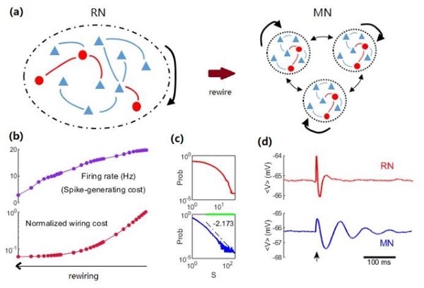 (a)RN与MN的结构示意;(b)神经发放率与网络连接消耗随网络重连的变化;(c)RN与MN的神经雪崩规模分布频率;(d)RN与MN受刺激后的响应。
