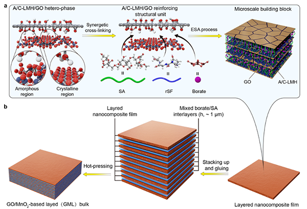 图:多尺度、多级次、多组分仿贝壳氧化石墨烯基复合板材的组装设计策略。