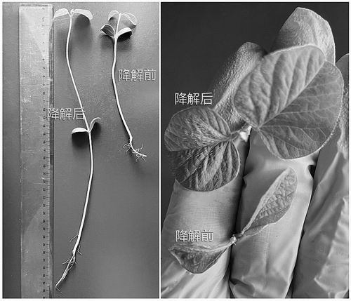 磺酰脲类除草剂降解前后对大豆茎(左)和叶(右)生长的影响。中国农科院供图