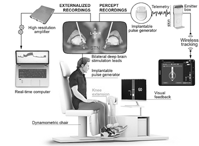 神经机器人平台的示意图。该平台研究在舒适和良好控制的条件下腿部肌肉激活的编码。患者进行膝关节伸展等运动,该装置记录肌肉激活和来自丘脑下核(STN)的信号。