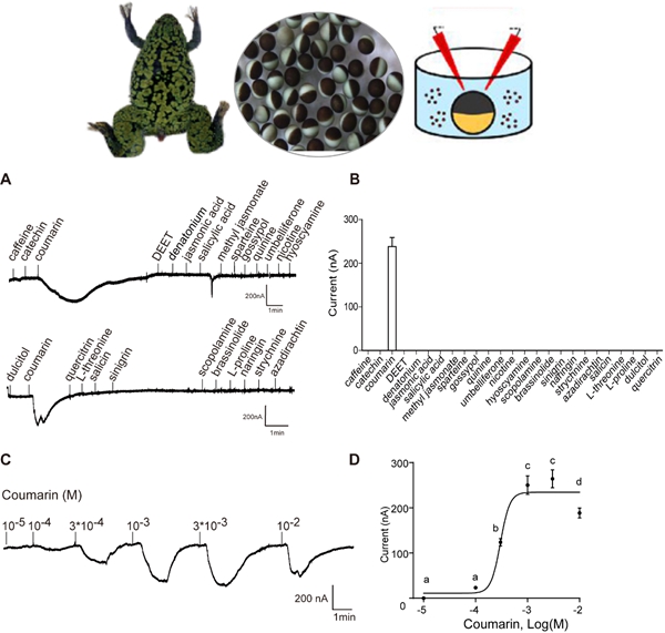 图1 表达HarmGr180的爪蟾卵母细胞对香豆素具有浓度依赖的电生理反应