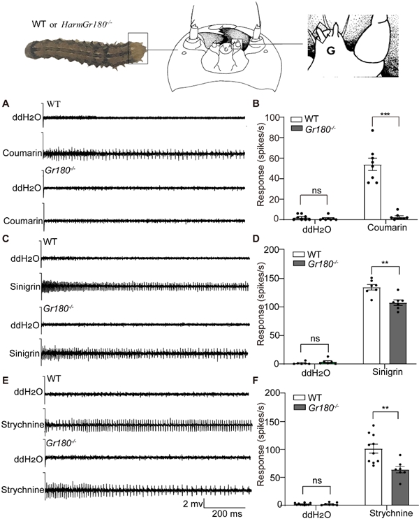 为了深入揭示HarmGr180的在体功能,研究团队利用CRISPR/Cas9系统成功地构建并获得了棉铃虫的HarmGr180纯合突变体(HarmGr180-/-)。研究发现,该突变体幼虫中栓锥感器失去了对香豆素的反应,同时降低了对黑芥子苷和马钱子碱的反应,但不影响香豆素对侧栓椎感器的抑制作用(图2)。进一步的行为学实验表明,尽管香豆素、黑芥子苷和马钱子碱对突变体幼虫仍有一定的取食遏制作用,但取食遏制指数显著降低。