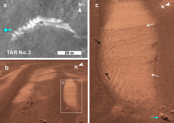 同时,由于横向风成脊是火星表面较为年轻的地貌(可能小于100万年),且这些多边形裂隙在横向风成脊演化的后期形成,因此它们可能指示了火星近期水活动及地表—大气水的交换过程,从而为研究火星在当前寒冷干旱气候条件下的水循环提供了线索。