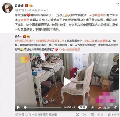 1月27日,某综艺节目中,演员@袁姗姗房间的混乱状况引发网友关注,网友们戏称:“这简直是个大型批发市场”“袁姗姗的房间是我本人”。27日下午,@中国消防发文提示称,袁姗姗衣帽间桌子上的卷发棒用完关闭了开关电源,但没有拔下插头,这个温度最高可达160到180摄氏度,有许多忘关电源引发火灾的报道。就怕一时疏忽酿祸,不用时要拔下插头。对此,袁姗姗回应表示:感谢提醒,消防知识要牢记,一定改正。