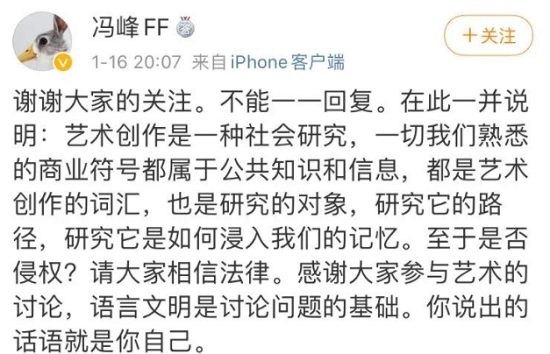 对此,冯峰回应称,“一切我们熟悉的商业符号都属于公共知识和信息”,并认为网友的质疑是“谩骂”,是“语言贫乏”的表现。