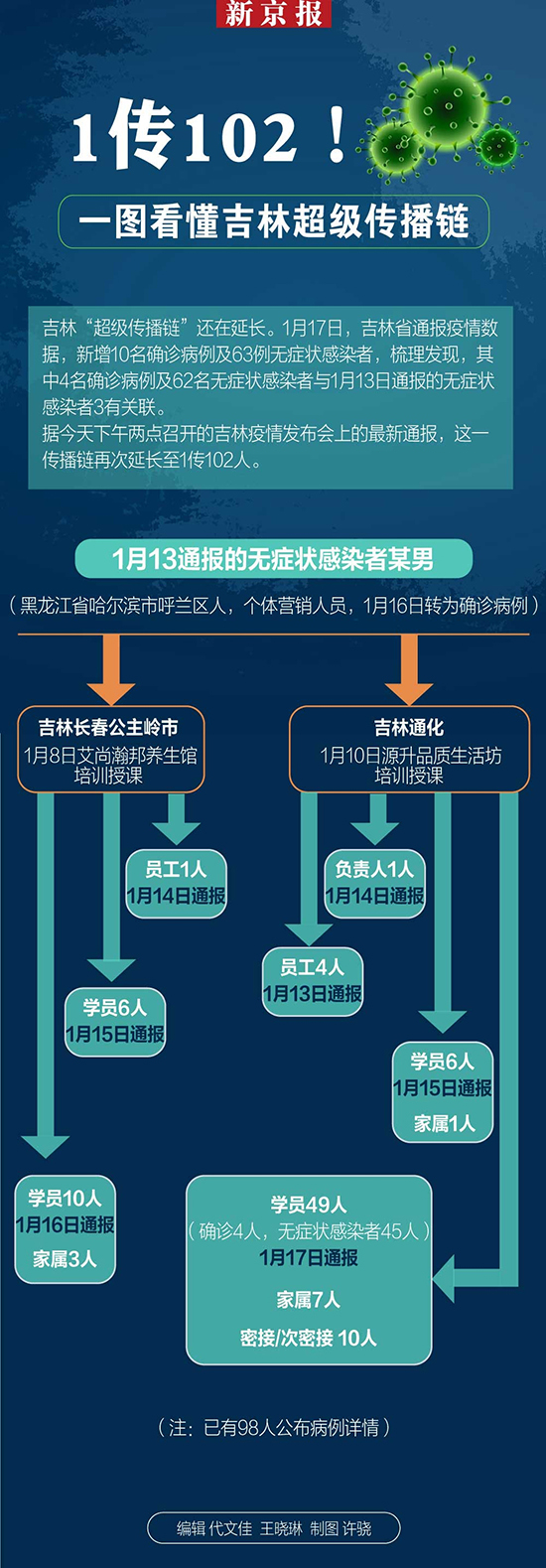 1月17日,吉林省通报了疫情防控最新情况:吉林省本次疫情传播链条清晰,为黑龙江省望奎县无症状感染者输入吉林省后引发本地传播。目前报告的114例感染者中,有9例为黑龙江省输入,105例为本地续发感染,在续发感染者中有3例是吉林省外输入感染者的家庭成员,另外102例续发感染者为同一输入病例林某传播,也即出现了“1传102”的“超级传播”现象。