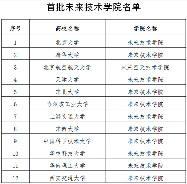 据报道,教育部近日印发《关于公布首批未来技术学院名单的通知》,经高校自主申报、专家论证,全国共有北京大学、清华大学等12所高校获批建设首批未来技术学院。这12所高校全部为“世界一流大学”建设高校。