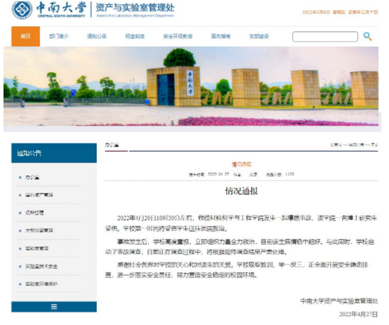 近期,一件高校实验室事故通报,让人备感揪心:4月27日,中南大学通报,该校材料科学与工程学院一实验室20日发生爆燃事故,一名博士研究生烧伤。