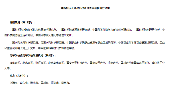开展科技人才评价改革试点单位和地方名单↑↑